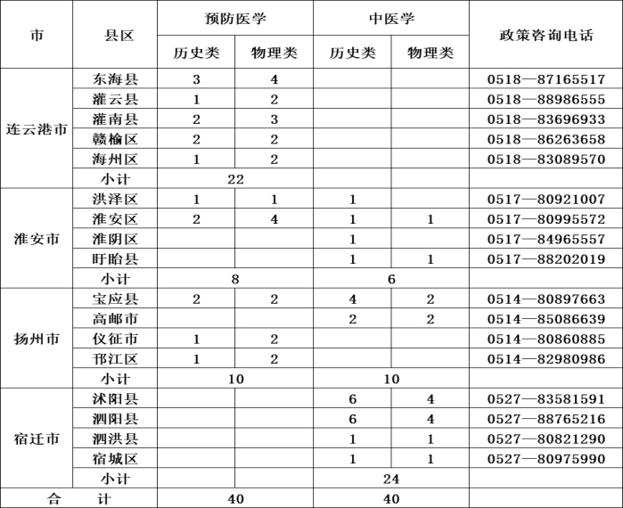 2023年我校将承担江苏省农村订单定向医学生免费培养工作,为农村基层医疗卫生机构培养医学人才。我校面向省内部分地区招生,只招收户籍等符合报考条件的应届高中毕业生(填报志愿前,请务必认真咨询当地卫生健康委员会)。招生专业为预防医学、中医学。在校学习期间免除学费,免缴住宿费,毕业后可参加户籍所在地基层医疗机构的公开招聘或“定向招聘”进编定岗。(具体入学及就业等政策,请咨询各地区卫健部门,联系方式如下。)